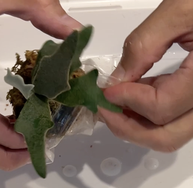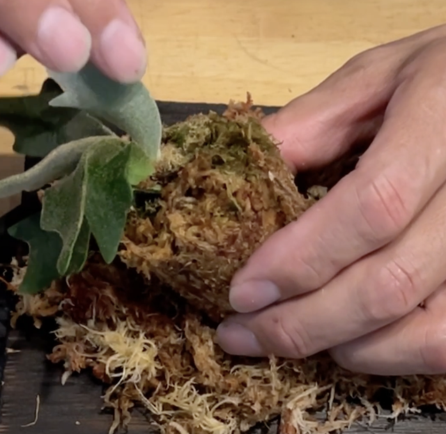 あとは、水苔で覆い、透明のミシン糸でぐるぐる巻きにしてしっかり固定していきます。